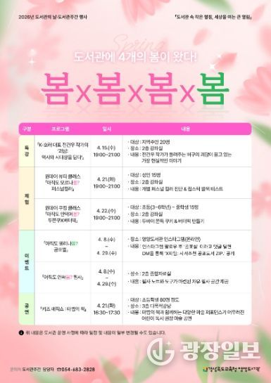 광장일보 주재영 기자 | 경상북도교육청 영양도서관은 2026년 도서관의 날·도서관주간을 맞아 ‘도서관 속 작은 펼침, 세상을 여는 큰 열림’을 공식 표어로 지역주민을 위한 강연, 체험, 공연, 이벤트를 운영한다.