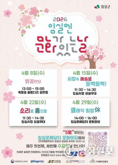 광장일보 주재영 기자 | 임실군 이 문화체육관광부와 지역문화진흥원이 주관하고 전북특별자치도 문화관광재단이 공모한 ‘2026 구석구석 문화가 있는 날’ 사업에 최종 선정 되어, 4월 8일부터 본격적인 행사를 시작한다.