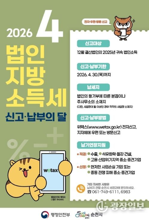광장일보 주재영 기자 | 순천시는 4월 한 달을 법인지방소득세 집중 신고·납부 기간으로 운영하며, 관내 법인들은 4월 30일까지 신고·납부를 완료해 줄 것을 당부했다.