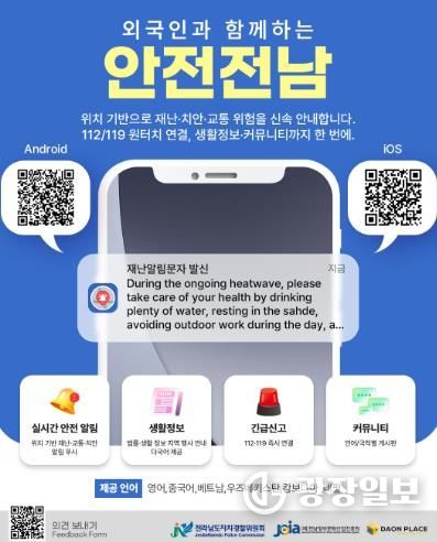 한편, ‘다국어 안전전남 앱’은 스마트폰 앱스토어에서 무료로 내려받을 수 있다.