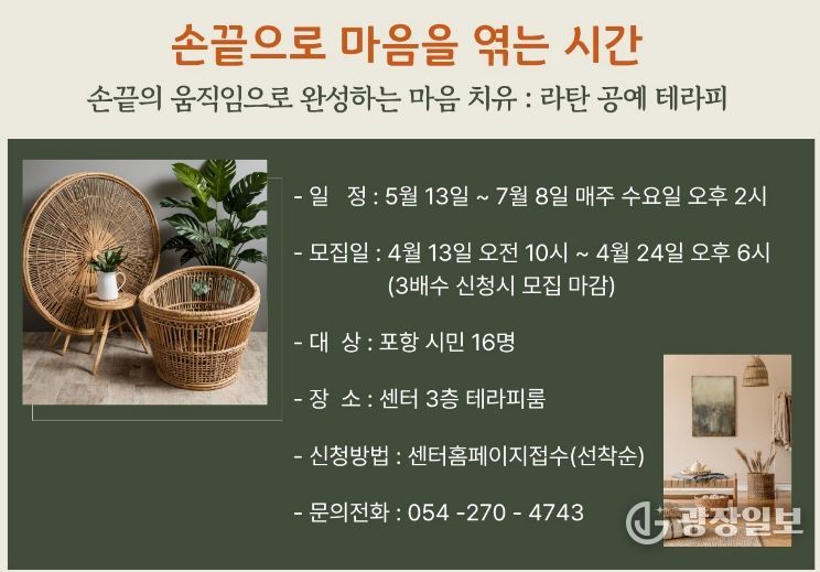 광장일보 주재영 기자 | 포항시 북구보건소 트라우마센터는 최근 국제 정세 불안과 각종 재난 상황 등으로 심리적 어려움을 겪는 지역 주민들의 정서 안정을 돕기 위해 ‘2026년 트라우마 공예 테라피–손끝으로 마음을 엮는 시간’ 프로그램을 운영한다.