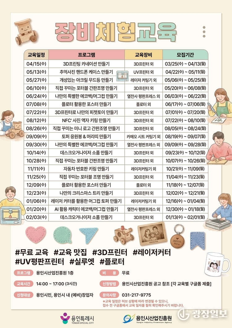 김홍동 용인시산업진흥원장은 "이번 교육은 시민들이 평소 접하기 어려운 장비를 활용해 제작 경험을 쌓고, 자신의 아이디어를 직접 구현해 볼 수 있는 기회가 될 것"이라고 밝혔다.