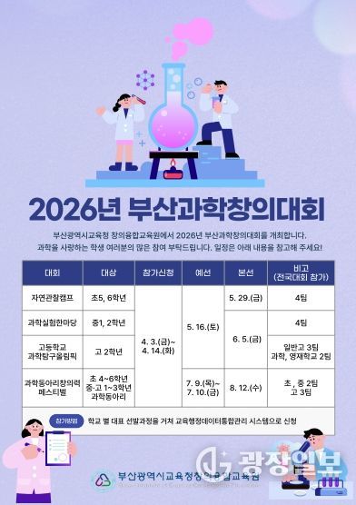 광장일보 주재영 기자 | 부산광역시교육청창의융합교육원은 오는 14일까지 과학 분에야 재능과 관심이 있는 부산 지역 초·중·고등학생을 대상으로 ‘2026년 부산과학창의대회’ 참가 신청을 받는다고 8일 밝혔다.