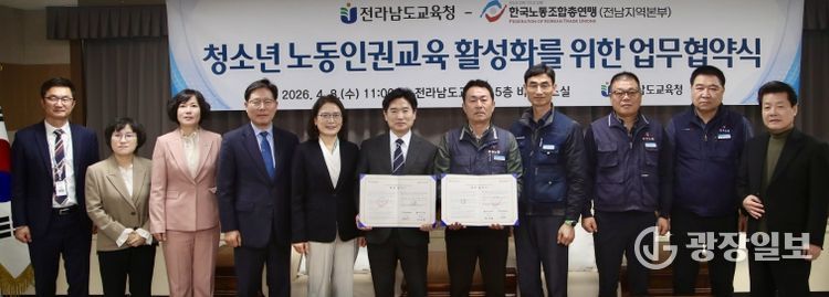 광장일보 주재영 기자 | 전라남도교육청은 4월 8일 청사 5층 비즈니스실에서 한국노동조합총연맹 전남본부와 ‘청소년 노동인권 보호·증진’을 위한 업무협약을 체결했다.