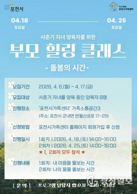 광장일보 주재영 기자 | 포천시 더 큰 행복 포천시가족센터는 사춘기 자녀를 둔 양육자를 대상으로 ‘부모 힐링 클래스’ 참여자를 모집한다.