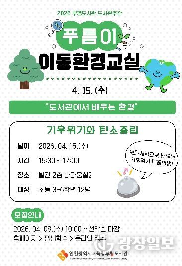 프로그램은 기후변화와 친환경을 주제로 보드게임을 활용한 체험형 교육으로 구성했으며, 4월 15일 오후 3시 30분부터 5시까지 부평도서관 별관 2층 나다움실2에서 진행된다.