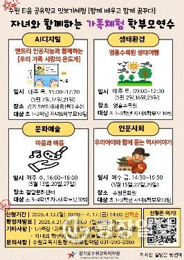 수원교육지원청은 오는 5월 한 달간 관내 초등학생 자녀와 학부모를 대상으로 지역 인프라를 적극 활용한‘2026년 가족체험 학부모연수’인 '공유학교 맛보기 체험:함께 배우고 함께 꿈꾸다'를 운영한다고 밝혔다.