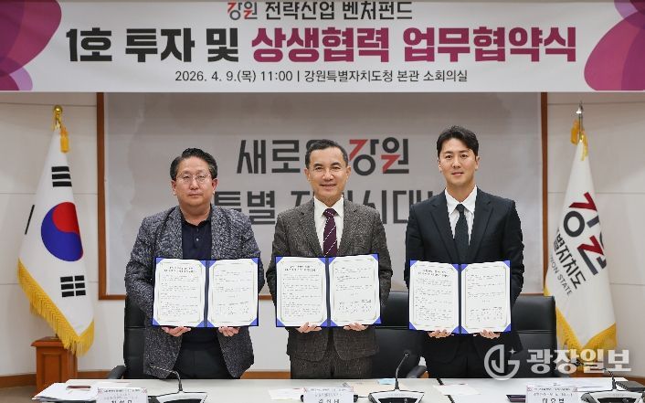 광장일보 이현나 기자 | 강원특별자치도는 4월 9일, 도청 본관 회의실에서 강원 미래산업을 견인할 [강원 전략 산업 벤처펀드]의 첫 번째 투자기업으로 기능성 바이오 소재 기반 사료첨가제 제조기업인 [밸류라움바이오]를 선정하고 이를 기념하는 [강원 전략산업 벤처펀드 제1호 투자 및 상생협력 협약식]을 개최했다.