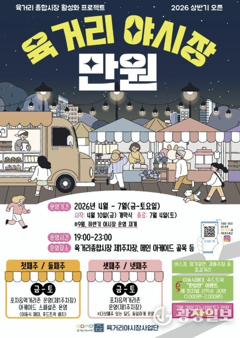 올해 상반기 야시장은 7월 첫째 주까지 매주 금요일과 토요일 오후 7시부터 11시까지 운영된다. 육거리시장 메인 아케이드 구간과 제1주차장 일원에서 먹거리 판매와 공연 프로그램이 진행될 예정이다.