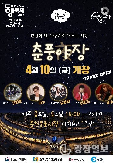 현준태 춘천시 부시장은 "지난해 큰 사랑을 받았던 춘풍야장이 올해는 더욱 풍성해진 콘텐츠와 쾌적한 환경으로 시민과 관광객을 맞이하게 됐다"며 "춘풍야장이 춘천의 밤을 대표하는 문화 관광 브랜드이자 지역 상권과 경제를 살리는 든든한 동력으로 확고히 자리매김할 수 있도록 적극 지원하겠다"고 밝혔다.