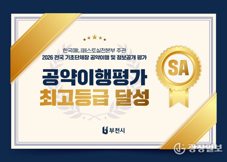 광장일보 =주재영 기자 | 부천시가 한국매니페스토실천본부가 주관한 ‘2026년 전국 기초단체장 공약이행 및 정보공개 평가’에서 최고등급인 SA를 받았다.