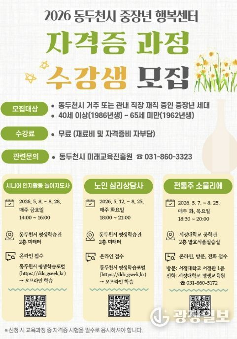 광장일보 주재영 기자 | 동두천시 미래교육진흥원은 지역 내 중장년층의 성공적인 인생 2막과 안정적인 사회 참여를 지원하기 위해 ‘2026년 중장년 행복센터 자격증 과정’ 수강생을 모집한다고 밝혔다.