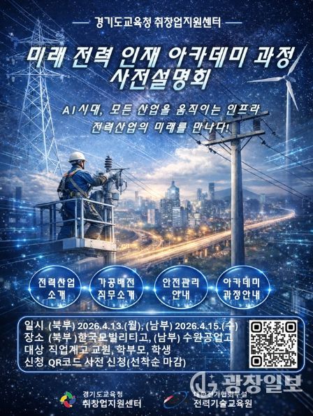 광장일보 박균현 기자 | 경기도교육청이 오는 13일과 15일 양일간 도내 직업계고 학생의 전력산업 분야 진로 탐색과 취업 역량 강화를 위한 ‘미래 전력 인재 아카데미 과정 사전설명회’를 개최한다.