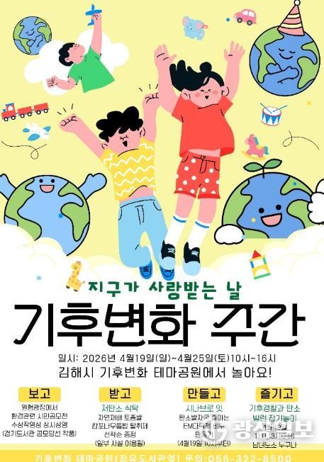광장일보 주재영 기자 | 김해시는 지구의 날(4.22)을 기념한 제18회 기후변화주간(4.20~24)을 맞아 시민들이 탄소중립을 쉽고 재미있게 체험할 수 있도록 김해탄소중립체험관과 기후변화테마공원에서 다양한 특별행사를 운영한다고 10일 밝혔다.