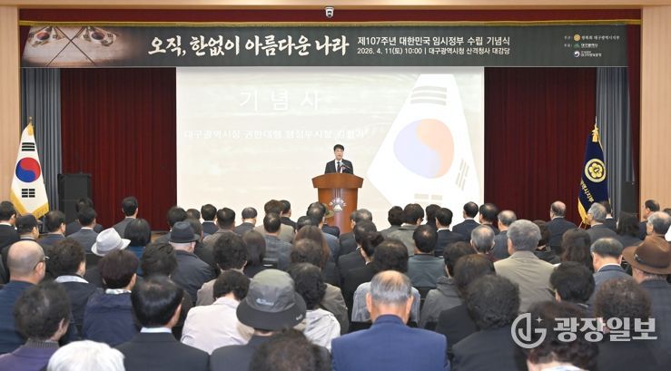 광장일보 주재영 기자 | 대구광역시는 대한민국 임시정부 수립 제107주년을 맞아 4월 11일 오전 10시, 시청 산격청사 대강당에서 기념식을 거행했다.