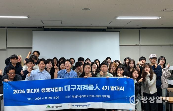 광장일보 주재영 기자 | 대구광역시와 대구광역자살예방센터는 4월 11일 오후 1시 영남이공대학교 천마스퀘어에서 지역 대학생 48명이 참여한 가운데 미디어 생명지킴이 ‘대구지켜줌人’ 제4기 발대식을 개최했다.