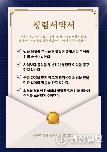 광장일보 주재영 기자 | 대구 동구청은 청렴 문화 확산과 공직기강 확립을 위해 청렴한 생활을 통해 모범이 될 것을 다짐하는 ‘청렴서약서’를 제작해 구청 부서 및 동행정복지센터 출입구에 부착했다.