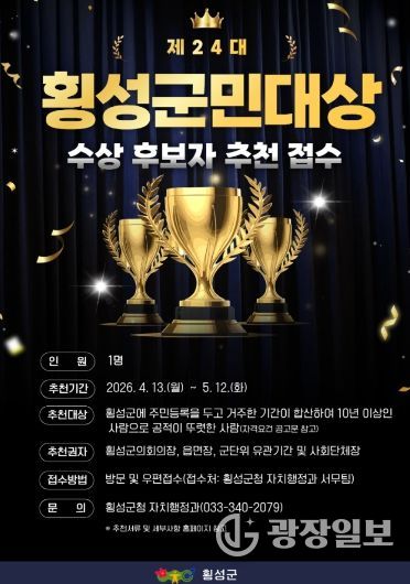 광장일보 이현나 기자 | 횡성군은'제24대 횡성군민대상'후보자를 4월 13일부터 5월 12일까지 추천받는다.