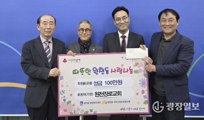 광장일보 박균현 기자 | 수원시 영통구 원천동은 지난 10일 원천장로교회가 지역 내 저소득 주민들을 돕기 위해 성금 100만 원을 행정복지센터에 기탁했다고 밝혔다.