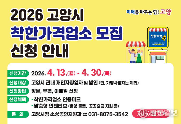 광장일보= 주재영 기자 | 고양특례시는 지역 내 물가안정에 기여할 '2026년 착한가격업소'를 새롭게 모집한다고 밝혔다.