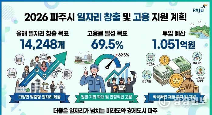 광장일보 주재영 기자 | 파주시는 2026년 ’일자리 1만 4,248개 창출‘과 ’고용률 69.5% 달성‘을 위해 1,051억 원의 예산을 투입하는 일자리 대책 세부계획을 수립·공시했다.