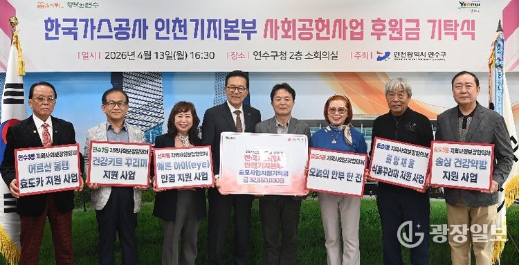 광장일보 주재영 기자 | 연수구는 지난 13일 한국가스공사 인천기지본부(본부장 윤상현)로부터 지역 내 도움이 필요한 이웃을 위해 써달라며 후원금 총 3,286만 원을 지정 기탁받았다.