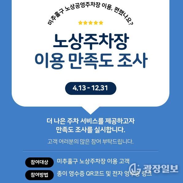 광장일보 주재영 기자 | 인천 미추홀구시설관리공단은 노상공영주차장 이용 고객의 다양한 의견을 수렴하고 서비스 품질을 향상하기 위해 ‘고객 만족도 조사’를 실시한다고 밝혔다.