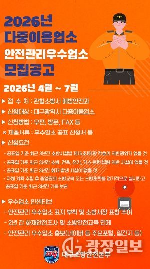 광장일보 주재영 기자 | 대구소방안전본부는 시민들이 안심하고 이용할 수 있는 환경을 조성하고, 영업주의 자율적인 안전관리 의식을 높이기 위해 ‘2026년 다중이용업소 안전관리 우수업소’ 신청을 접수한다.