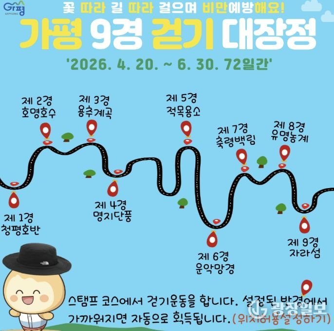 광장일보 주재영 기자 | 가평군의 수려한 자연경관을 배경으로 건강을 다지는 ‘2026 가평 9경 걷기 대장정’이 오는 20일부터 시작된다. 가평군보건소는 군민들의 비만을 예방하고 걷기 실천율을 높이기 위해 이번 프로그램을 마련했다고 15일 밝혔다.