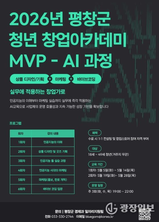 광장일보 이현나 기자 | 평창군은 강원특별자치도 공모사업인 '2026년 지역산업 맞춤형 일자리 창출 지원사업'으로 ‘청년 창업아카데미(MVP)-AI 과정’을 본격적으로 운영한다.