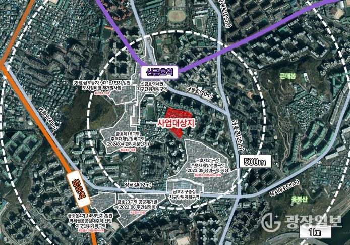 대상지는 5호선 신금호역 역세권에 위치하고 있어 광화문, 종로 등 강북 도심권(CBD)과 여의도(YBD)로의 접근성이 좋으며, 응봉근린공원, 대현산 배수지 공원 등 다수 공원이 인접하고 있어 녹지공간이 풍부하며, 왕십리 지역과도 근접해 있어 역세권 중심의 직주근접 도시 형성에도 크게 기여할 것으로 예상된다.
