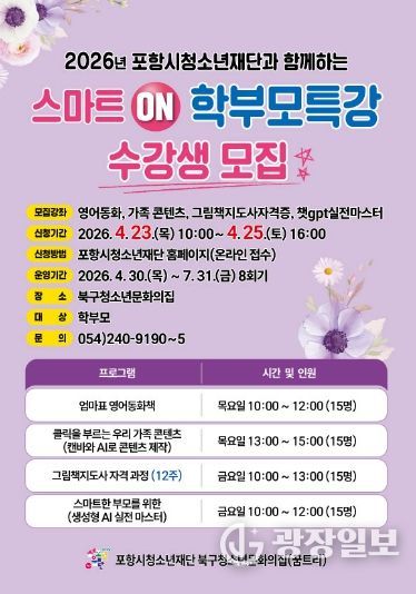 광장일보 주재영 기자 | 포항시청소년재단 북구청소년문화의집은 오는 23일부터 자녀의 창의적 사고력과 문화적 감수성 함양을 지원하기 위한 학부모 특별 프로그램 ‘스마트 ON! 학부모특강’ 참가자를 모집한다.