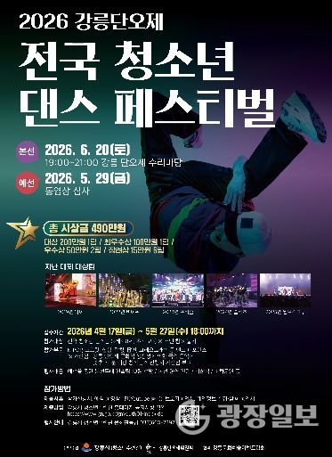 광장일보 이현나 기자 | 강릉시 청소년수련관은 오는 6월 20일 오후 7시 강릉단오제 수리마당에서 개최되는 ‘2026 강릉단오제 전국 청소년 댄스 페스티벌’의 참가팀을 17일부터 5월 27일까지 모집한다.