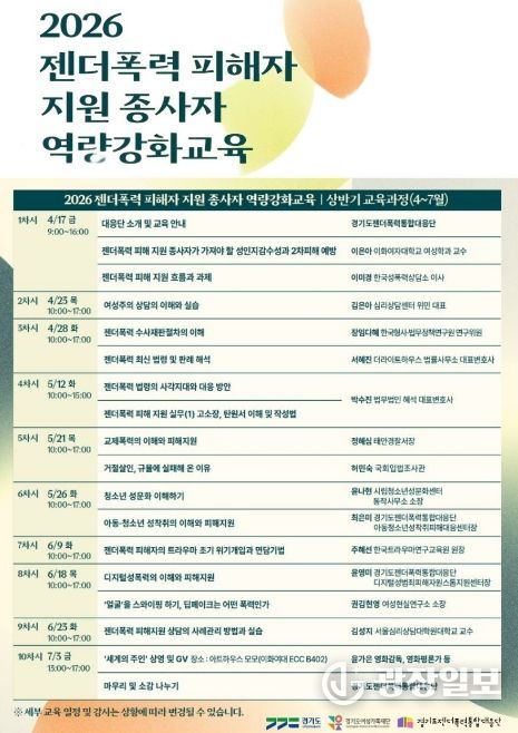 광장일보 박균현 기자 | 경기도와 경기도젠더폭력통합대응단이 17일 도내 젠더폭력 피해 지원 현장 종사자들의 전문성 향상을 위한 ‘2026 역량강화 교육’ 상반기 과정을 시작하며 현장 대응력 강화에 나섰다.