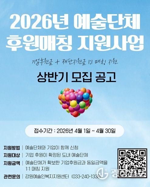 광장일보 이현나 기자 | 강원문화재단은 도내 예술단체의 안정적인 창작기반 마련과 기업의 문화예술 후원 참여 확대를 위해 '2026년 예술단체 후원매칭 지원사업' 상반기 공모를 추진한다.