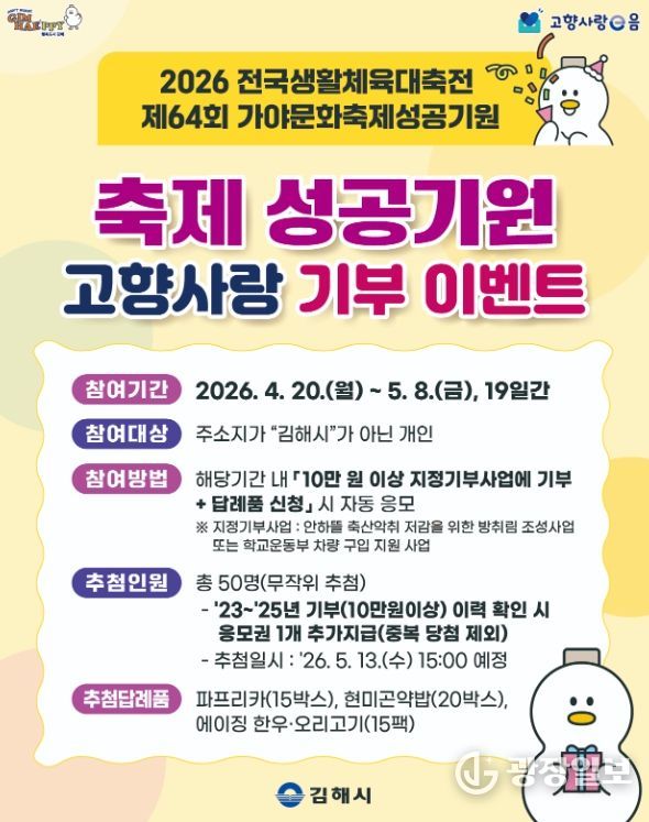 김해시 관계자는 “이번 이벤트는 대규모 체육·문화 행사의 성공을 기원하고 지역의 시급한 현안을 해결하는 지정기부 사업을 널리 알리기 위해 기획됐다”며, “고향을 사랑하는 마음이 담긴 기부가 지역 발전의 큰 힘이 되는 만큼 많은 분의 적극적인 관심과 참여를 부탁드린다”고 전했다.