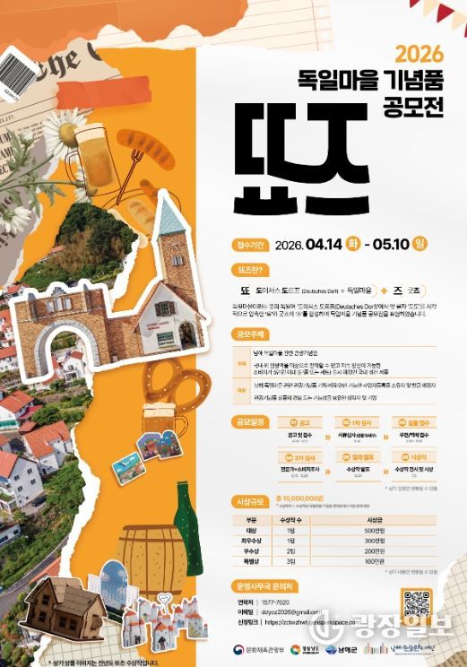 광장일보 주재영 기자 | 남해군관광문화재단이 ‘2026 독일마을 기념품 공모전, 뚀즈’를 개최하기로 하고, 4월 14일부터 5월 10일 18시까지 참가 접수를 진행한다고 밝혔다.