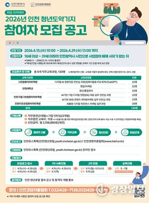 광장일보 주재영 기자 | 인천광역시는 청년의 취업역량을 강화하고 지역기업이 필요로 하는 실무형 인재를 양성하기 위해 ‘2026 인천 청년도약기지’ 사업 참여자 130명을 4월 15일부터 4월 29일까지 모집한다고 밝혔다.