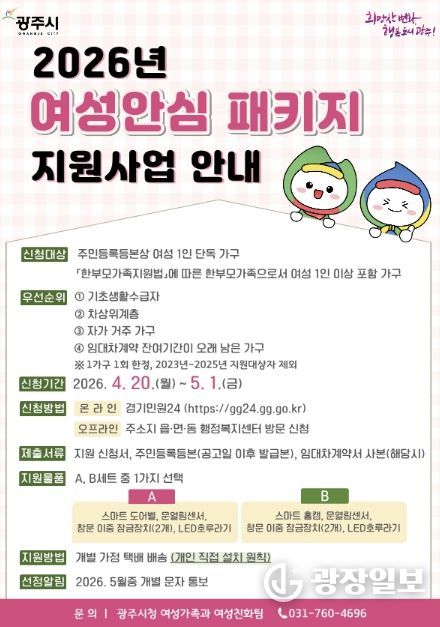 광장일보 주재영 기자 | 광주시는 여성 1인 가구와 한부모가족의 생활 안전 강화를 위해 ‘여성 안심 종합 지원사업’ 대상자 35가구를 오는 20일부터 5월 1일까지 모집한다고 17일 밝혔다.