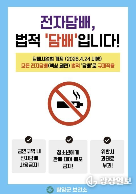 광장일보 주재영 기자 | 함양군 보건소는 전자담배를 포함한 모든 담배 제품의 금연구역 내 사용을 규제하는 '담배사업법' 개정에 따라 오는 4월 24일부터 5월 15일까지 집중 점검을 실시한다고 밝혔다.