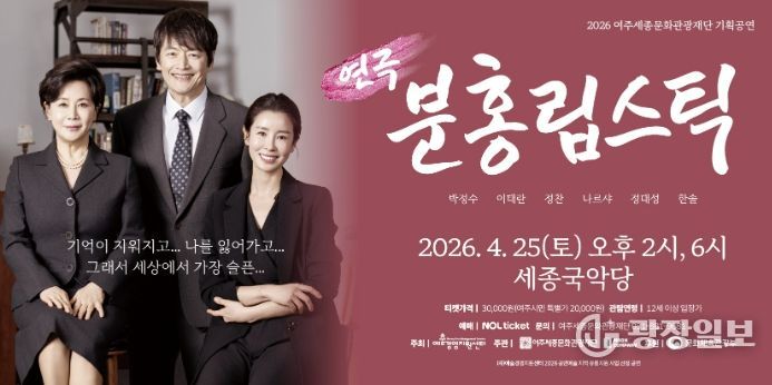 광장일보 주재영 기자 | 여주세종문화관광재단이 오는 4월 25일, 예술경영지원센터의 공모사업인 '공연예술 지역 유통지원 사업'의 일환으로 베테랑 배우들이 참여한 창작 연극‘분홍립스틱’을 세종국악당에서 개최한다.