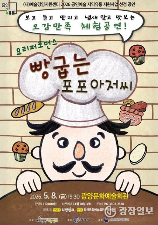 광장일보 주재영 기자 | 광양시는 5월 가정의 달을 맞아 오는 5월 8일 오후 7시 30분 광양문화예술회관 대공연장에서 극단선물의 어린이 참여형 뮤지컬 ‘빵굽는 포포아저씨’를 선보인다고 밝혔다.