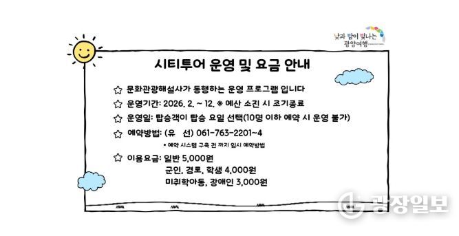 한편, 광양시티투어는 산업관광 코스를 비롯해 야경·힐링·역사 등 다양한 테마로 운영되며, 자세한 사항은 광양시 문화관광 누리집 ‘여행준비’의 ‘시티투어’ 코너에서 확인할 수 있다.