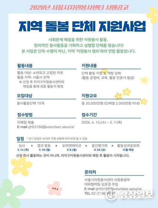 광장일보 주리아 기자 | 서울시자원봉사센터는 복지 사각지대 주민의 외로움 해소를 위해 자치구자원봉사센터(자원봉사 캠프)와 협력하여 신규 봉사활동을 기획하고 운영할 비영리 단체를 모집한다고 밝혔다.