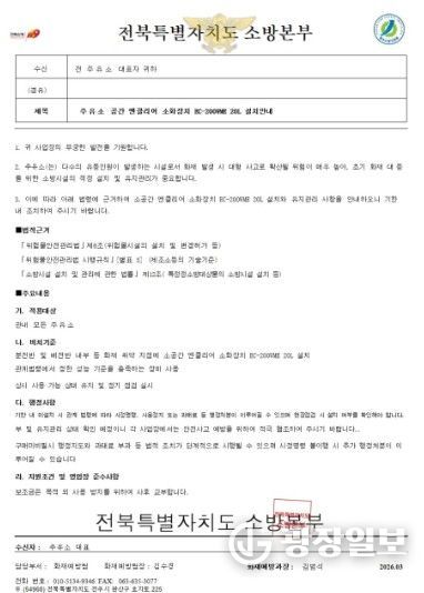 광장일보 주재영 기자 | 전북특별자치도소방본부는 최근 소방공무원을 사칭해 소방시설 구매를 강요하거나 보조금 지원을 미끼로 금전을 갈취하는 사례가 잇따르고 있어 관계인의 각별한 주의가 필요하다고 17일 밝혔다.
