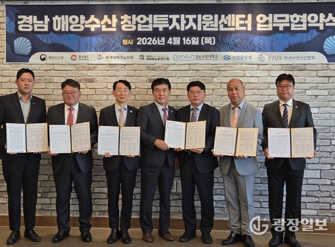 광장일보 주재영 기자 | 경상국립대학교 해양과학대학은 경상남도 해양수산 창업투자 활성화를 위해 4월 16일 경남테크노파그에서 경상남도, 경남테크노파크, 경남항노화연구원, 수협중앙회 경남본부, 경상남도 청년어업인연합회 등과 업무협약(MOU)을 체결했다.