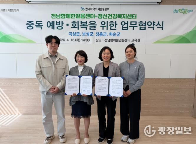 광장일보 주재영 기자 | 화순군은 지난 16일 화순군정신건강복지센터가 전남함께한걸음센터와 지역사회 마약류 및 약물 오남용 예방과 회복 지원 강화를 위한 업무협약(MOU)을 체결했다고 밝혔다.