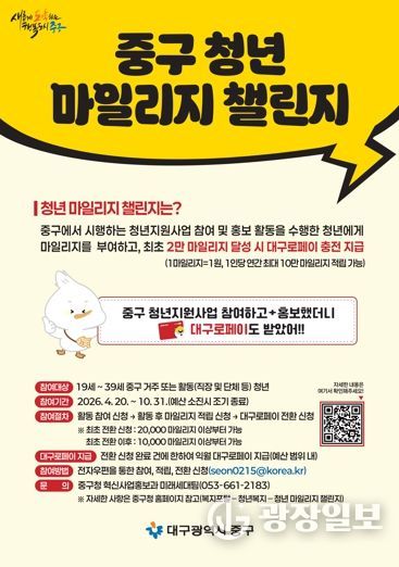 광장일보 주재영 기자 | 대구 중구는 청년들의 청년지원사업 참여를 확대하고 정책 인지도와 체감도를 높이기 위해 ‘청년 마일리지 챌린지’를 4월 20일부터 10월 31일까지 시행한다.