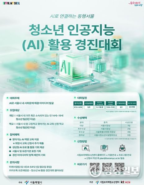 광장일보 주리아 기자 | 서울시는 청소년이 인공지능(AI)을 활용해 지역사회 문제해결 아이디어를 제안하고 이를 공공정책으로 연결하는 '2026 청소년 인공지능(AI) 활용 경진대회'를 개최하고 4월 30일까지 참가자를 모집한다.