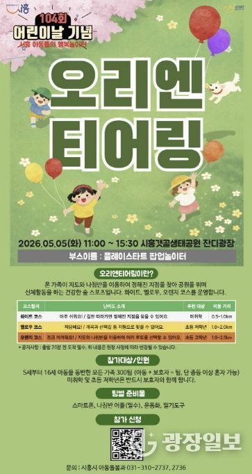 광장일보 주재영 기자 | 시흥시는 제104회 어린이날을 맞아 5월 5일 갯골생태공원 잔디광장에서 아동과 가족이 함께 즐길 수 있는 ‘5월 플레이스타트 팝업놀이터’를 운영한다. 이번 행사는 시흥시 어린이날 기념행사의 하나로 마련돼 행사장을 찾은 가족들에게 다채로운 프로그램으로 즐거움을 선사할 예정이다.